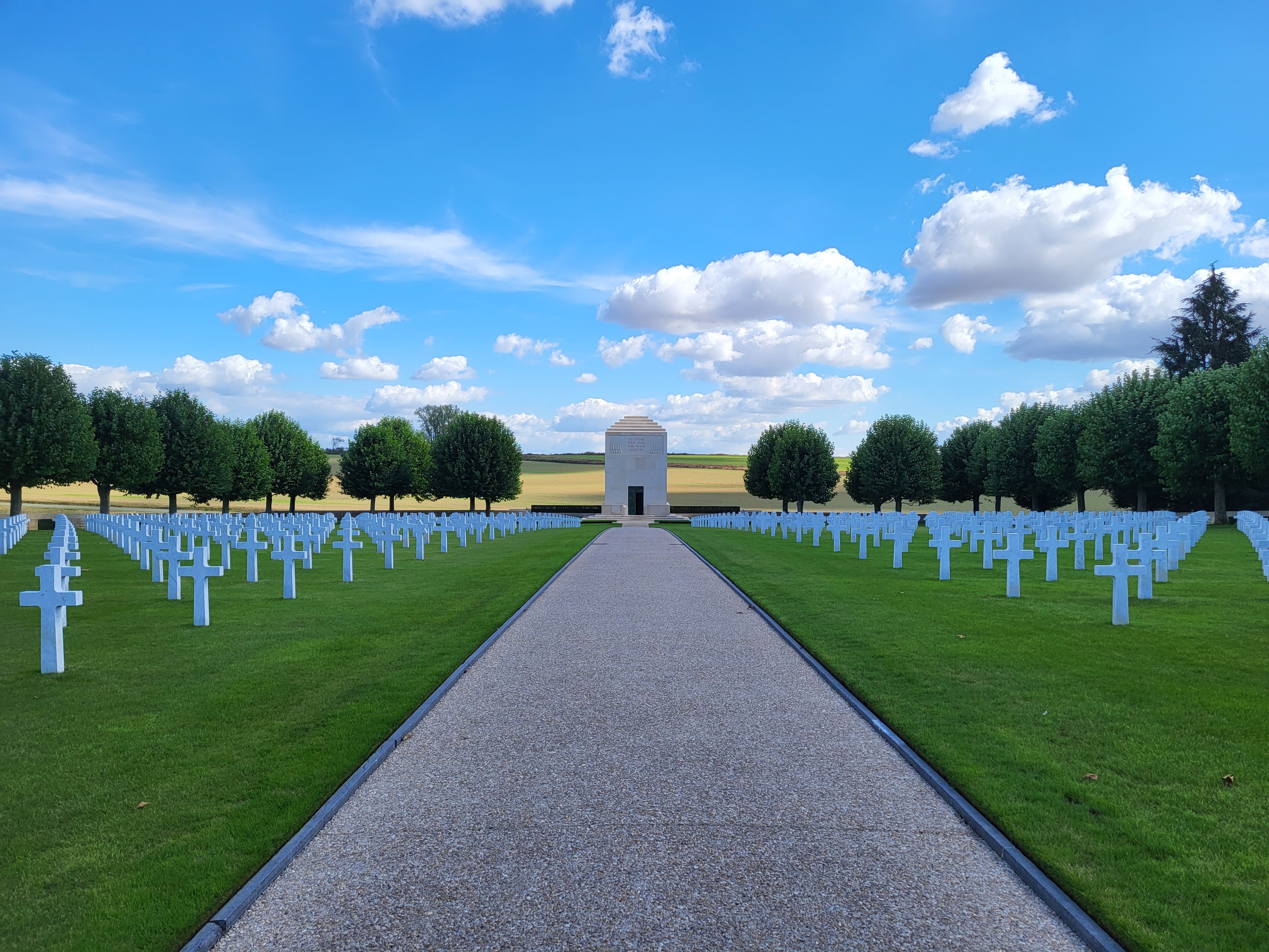 Mon guide Régis m'a amené ici dans ce cimetière peu connu, honorant l'implication américaine lors de l'offensive des 100 jours dans la Somme. Je me considère comme un passionné d'histoire, mais je ne savais rien de l'importance de l'implication des troupes américaines dans la percée de la ligne Hindenburg dans cette région. Le personnel était extrêmement accueillant et compétent. C'est un endroit très paisible et bien entretenu pour se promener et en apprendre davantage sur ces héros américains méconnus qui ont contribué à mettre fin à la Grande Guerre. À l’intérieur de l’une des structures se trouve un magnifique ensemble de vitraux montrant les insignes de toutes les divisions qui ont combattu dans cette bataille. Visiter ici m'a inspiré à en savoir plus sur cette bataille.