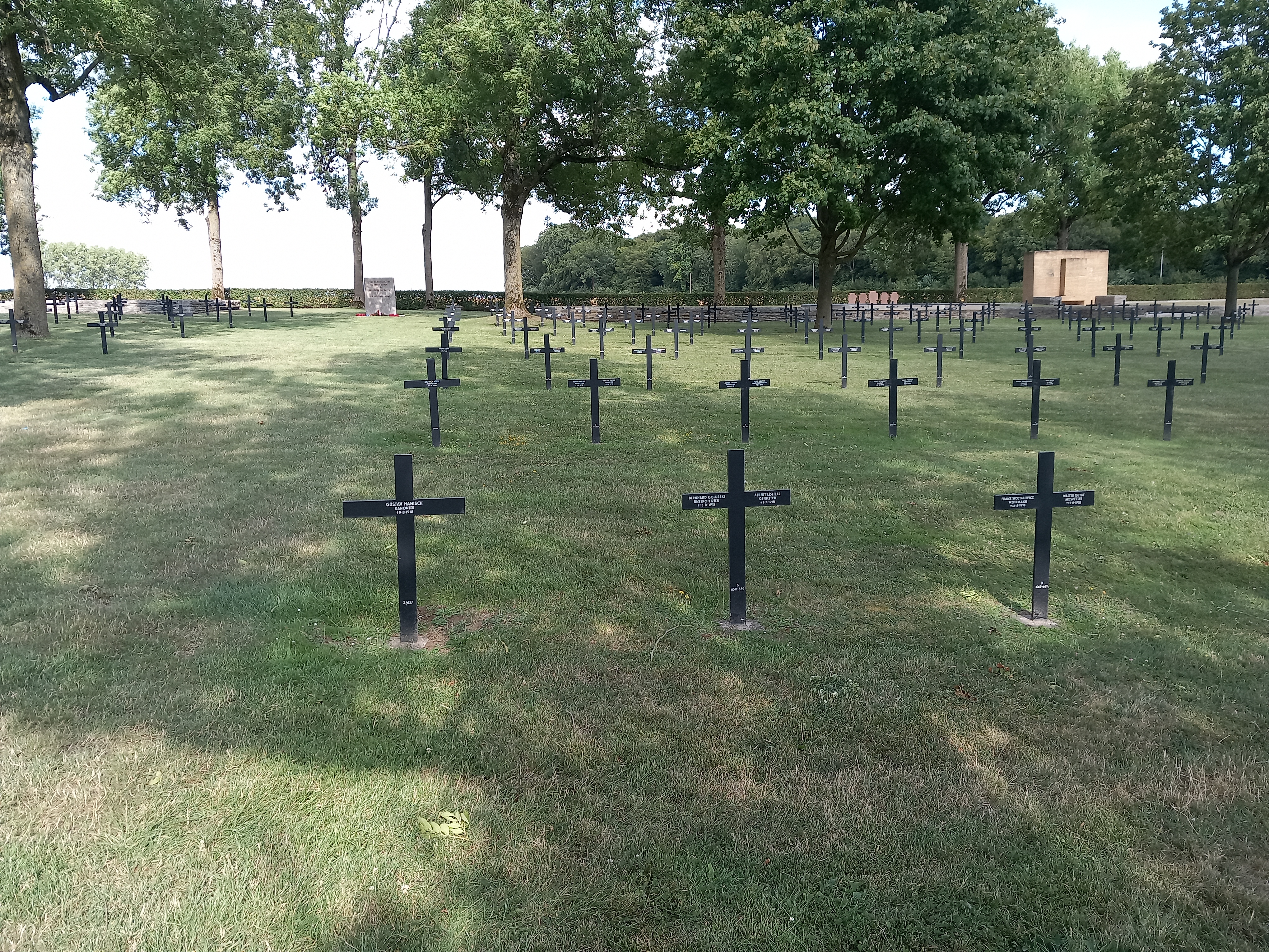 Il semblerait que contrairement aux soldats britanniques et français qui disposent chacun d'un espace et d'une pierre tombale pour eux, les Allemands sont enterrés à 4 hommes ensemble et doivent partager une pierre tombale. Une manière d’enterrer moins digne mais compréhensible compte tenu des circonstances. On note également ici les nombreux soldats juifs qui servirent dans les rangs allemands dans cette guerre.