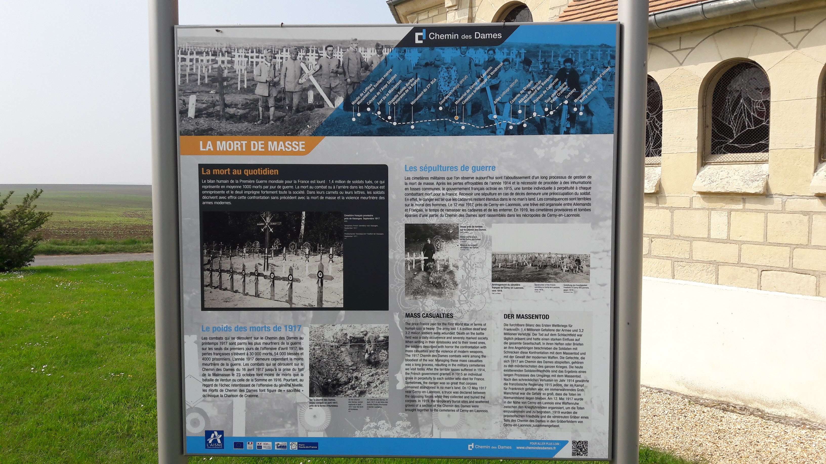 Sur le même Chemin de Dames se trouve le cimetière militaire français de Cerny-en-Laonnais où reposent 5 150 soldats français et 54 soldats russes morts au combat dans la région pendant la Grande Guerre 1914-1918. Devant la nécropole se trouve une chapelle : Mémorial du Chemin des Dames. Derrière le cimetière français se trouve le cimetière militaire allemand avec plus de 7 500 morts.