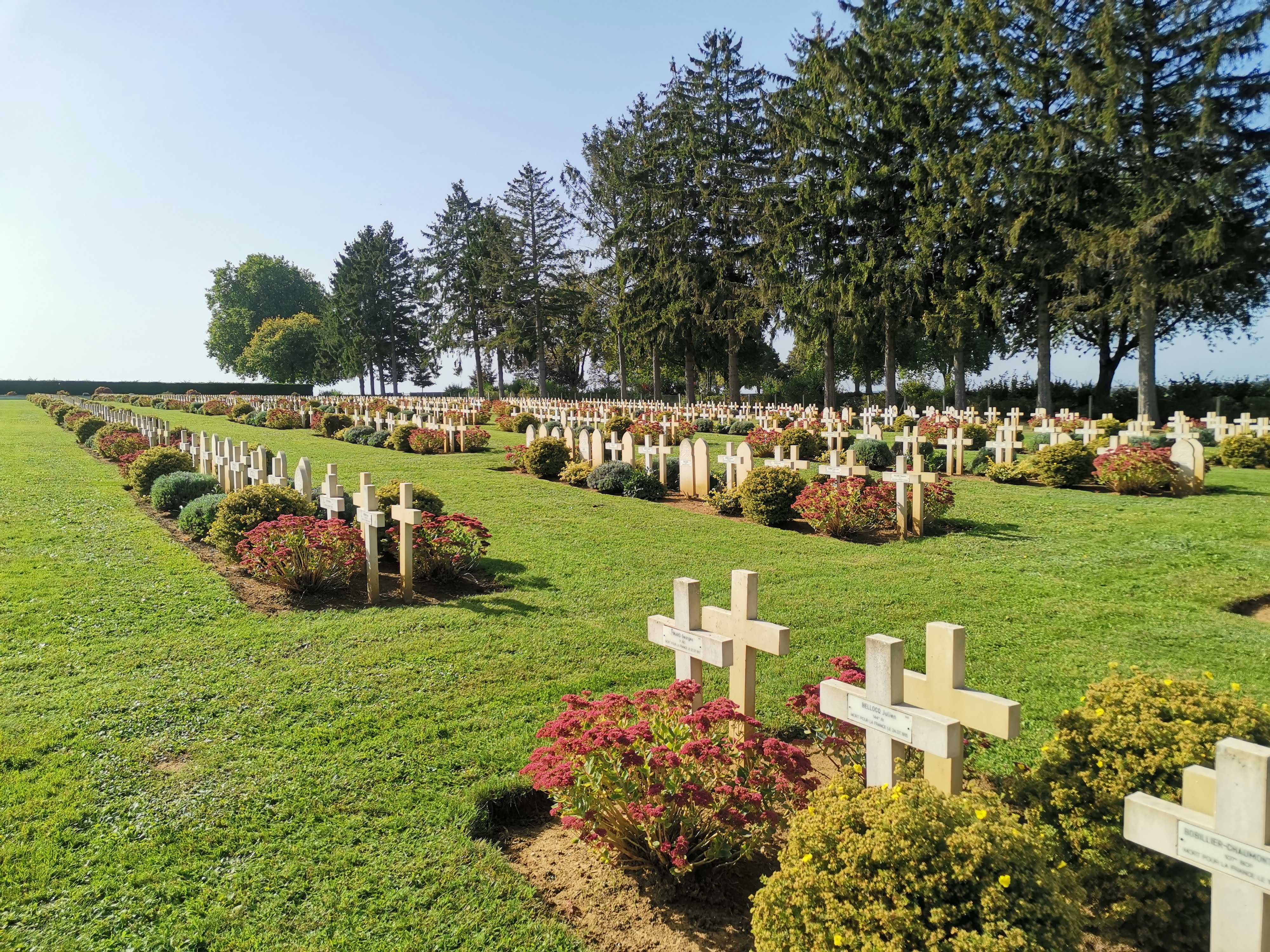 Un autre cimetière Français entretenu, avec un drapeau, fleuri, etc. 3 dans le même secteur alors qu'à à peine 20 km d'ici, il y a le même type de cimetière non fleuri, mal entretenu et avec des trous dans la pelouse. Là c'est verdoyant, hyper fleuri, bien entretenu. C'est simple, on se serait cru en cimetière britannique. Parfait ! A noter, des tombes de soldats soviétiques.